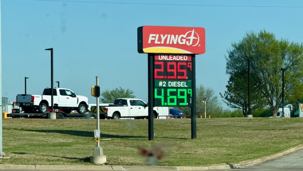 We have to remember to try to check out Texas stations. They have 86 octane and the RV needs 87 octane. Now we’ve put a custom engine tune in, and Paul recently asked them to add 86 and they did. But they also were asked to change the transmission programming and it isn’t clear if they did or not. So we’re hesitant to run 86 octane. Fortunately the tank was half full of 88 from the previous stop so we were good. We didn’t want to add 88 octane here since it was $0.45 more and when you’re filling what we’re filling it adds up. Oh, and to add insult to injury they mis-scanned the loyalty card so we didn’t get our $0.10 discount. (susan here: bad Flying J!)
