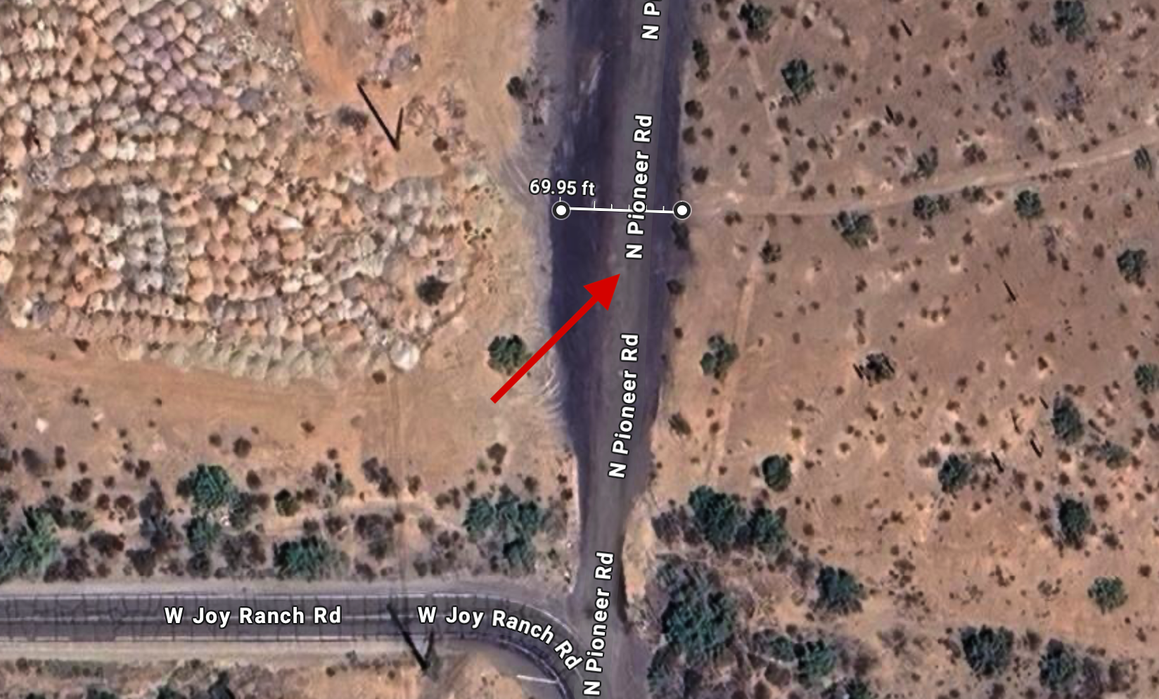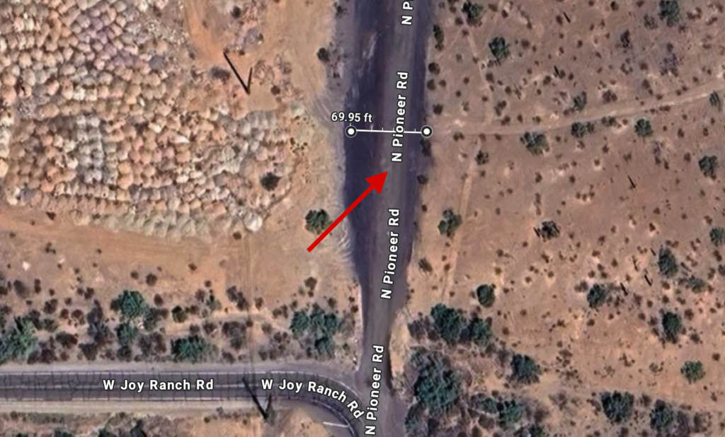 If you recall from the night we spent in the brewery — Paul here: LOL, yeah, which one!? — we measured the turning radius at about 70 feet. What sat view does show is the drop-off, Clifford got really tippy, but we crept along and made the turn without incident.