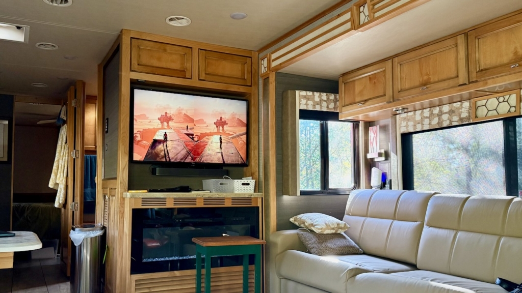 The site is pretty sloped at the front, but the back was fine. We’re trying really hard not to use our leveling jacks. We want to remove them to gain 270 pounds of cargo weight we can use for ham radio, knitting and more games!