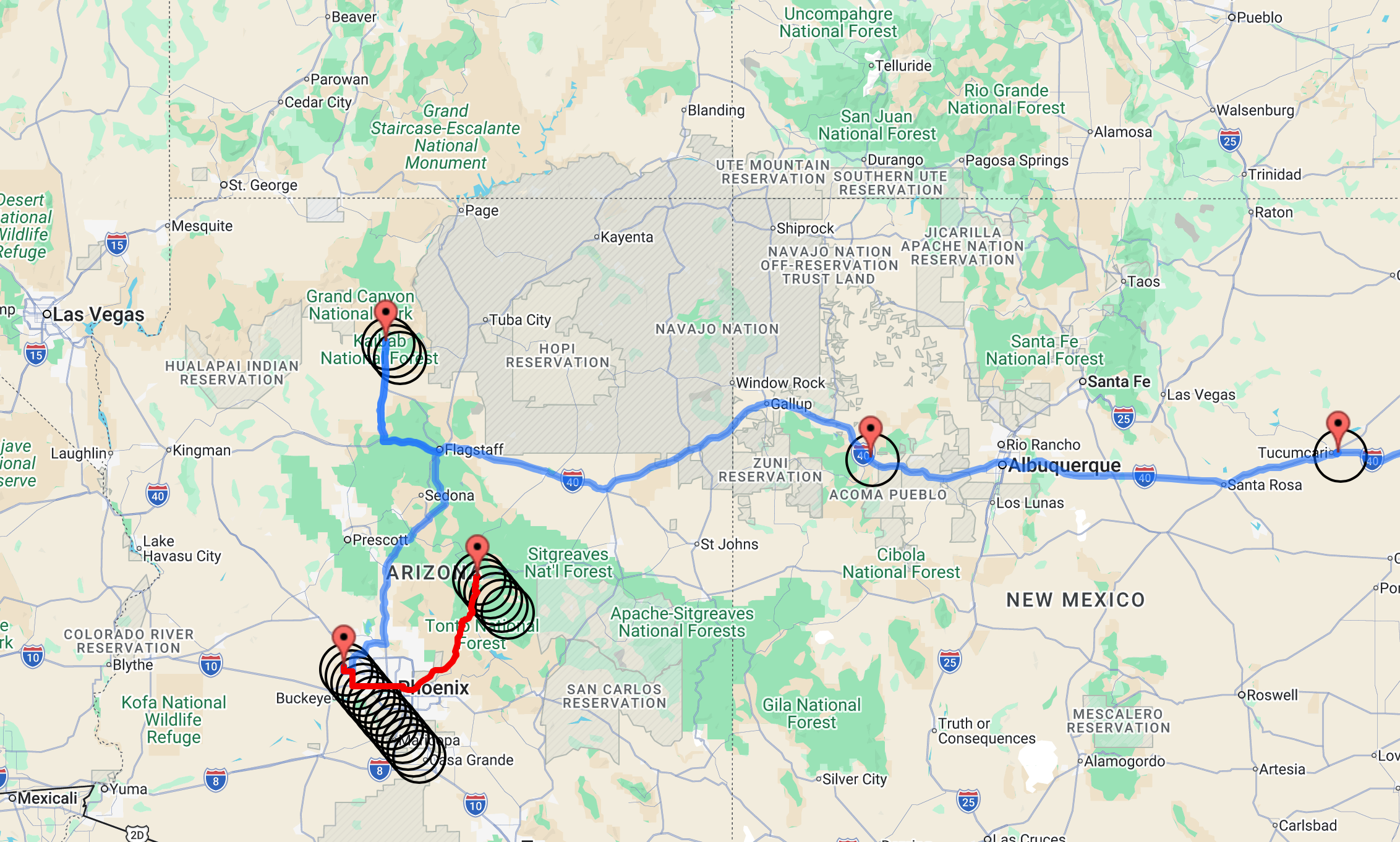 This is the trip of Let ‘Er Rip. The No Plans trip. But we’ll need to start making plans. We think we’re going to stay in the northern part of AZ for quite some time. So let’s zoom in the map further for now.