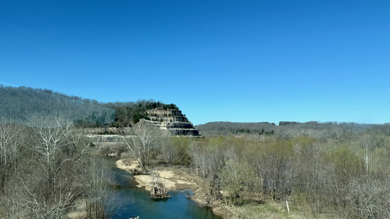 There is a road at the base of that, that’s how they carved away the cliff face to make room for the road. It would be cool to find an old photo from before the road was put in. (susan here: not that this is a hint for Paul’s brother John. Nope. Not at all.) This is in the Mark Twain National Forest and the water is the Little Piney Creek. It looks delightful to paddle. The only drawback would be the constant sound of traffic.