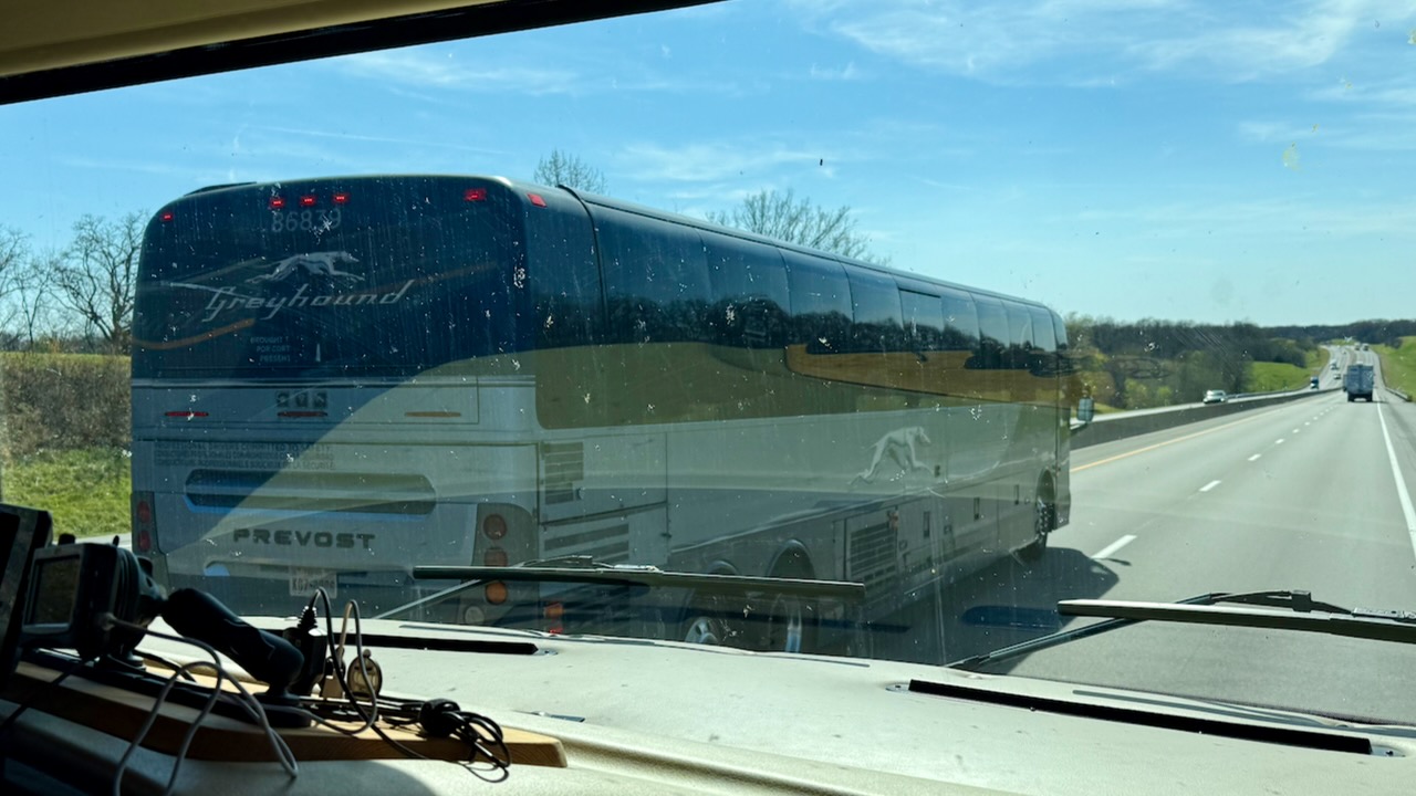 In all of our travels, we don’t ever recall seeing a Greyhound bus. Now we have.