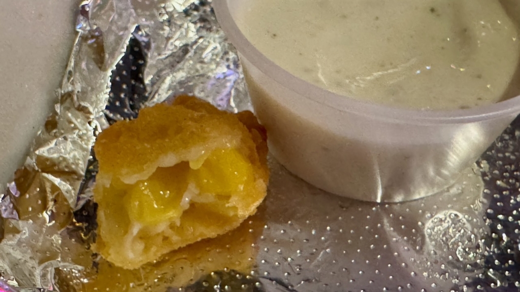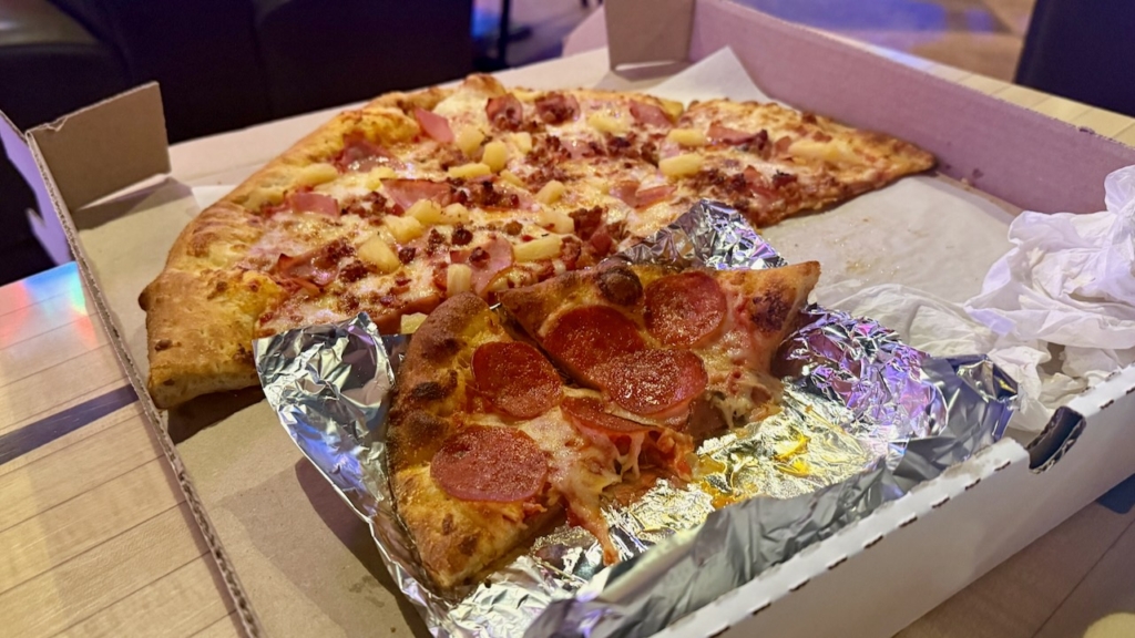 This was only about a tenth of the signs and neons in this room. We ordered pizza and Corn Nuggets. Corn nuggets are made of sugar corn, with sugar, clumped together somehow, then breaded and fried. OMG, so good, we almost forget to get a picture, here’s the last half one left. (susan here: it’s made of corn so it’s healthy right? LOL)