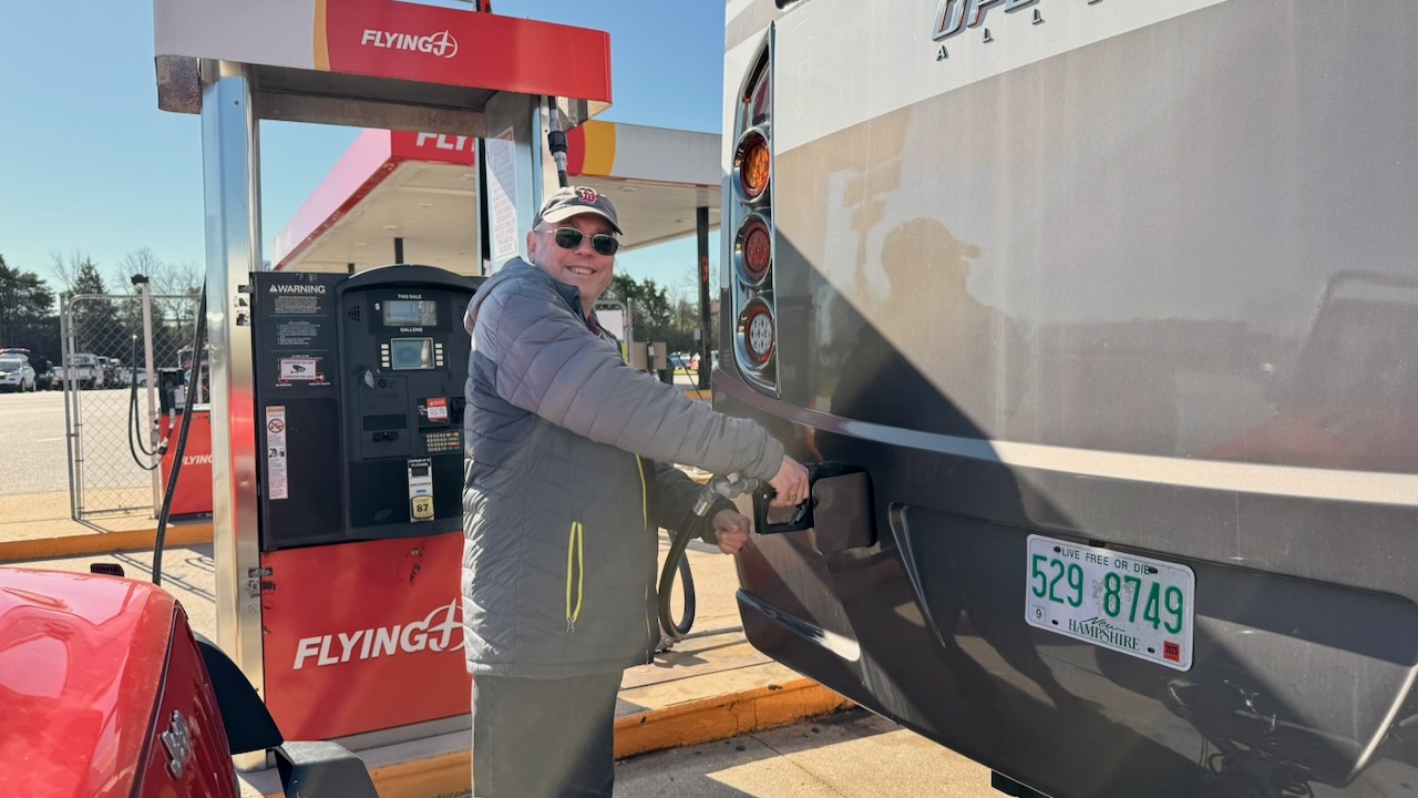 If you want to go on adventure, you gotta gas up! We can’t believe we’ve never gotten this shot before. It may be spring on the calendar but it was pretty chilly this morning so we’re still wearing winter coats.