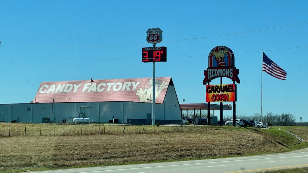 This is Redmon’s Candy Factory. Just like Buc-ee’s, The Big Texan in Amarillo and South of the Border just off I-95 in Hamer, SC we’ve been seeing billboards since we were about 100 miles out. Curiously, they just talk about candy, not the name of the store. (susan here: one thing I’ve noticed about these kinds of places is that their billboards are all roughly the same graphics style. Perhaps it sets expectations? Who knows.)