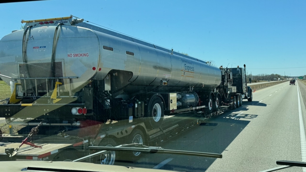 This fuel truck for airports on a flatbed passed us. The front is asymmetrical. There’s a small driver’s box that you can’t see from the passenger side. We had just passed it when it was entering the highway.