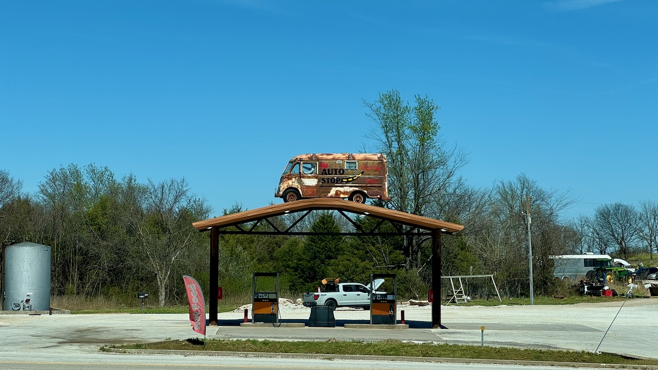 We’ve been doing off/on ramp driver changes. There are very few rest areas out here. After one change we looked out the window and saw this. It is the sign for an auto parts store.