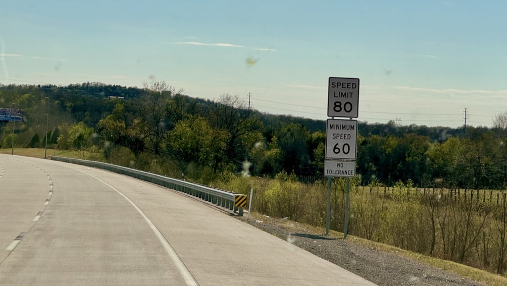 There was a police officer playing leap frog with us, staying behind, then passing and staying in front. We figured out his game though, he was doing mobile, not stationary speed enforcement. Speed limit was 75 mph, so just how fast was that guy going for the officer to pull him over?