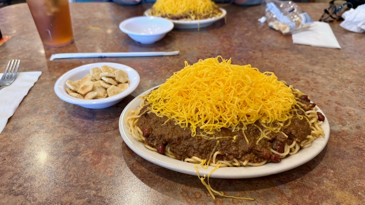 You heard the story yesterday so we won’t repeat it. Susan wasn’t looking forward to the place. You see, she doesn’t eat beef and the Skyline Chili is a one trick pony. Oh, there are other things, but they all seem to be based on the same beef chili sauce. She was quite pleased to find they have a chicken chili now! Paul also had some mild trepidation. You see on the surface Cincinnati chili doesn’t sound all that appetizing. Chili with cinnamon? But he’s drawn to local foods like a moth to a lamp. He figured he’d choke it down somehow… (susan here: like a moth to a lamp for any food! I swear he’s part Hobbit.)