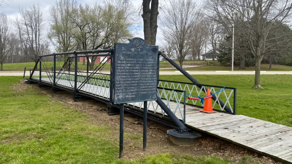 Hiram B. Trout and his brother, Everett Trout, were born on a farm about five miles north of this location. They operated a machine shop in Shelbyville, Illinois in the late 1800’s at which in time they invented and patented the unique design for this Pony Truss bridge. They built about 150 of these bridges between 1892 and 1897 which were erected in Shelby and neighboring counties. The design feature which makes this bridge unique is the use of round pipe in the top chords, end posts, and verticals instead of the usual rivet connected channel plates, and angle iron material. This bridge was erected on a township road near the small community of Fancher in Shelby County. It was in service for 88 years from 1895 until 1983 when it was reduced in width from 16 to 8 feet and moved 70 miles to this location for preservation by the Illinois Department of Transportation.
