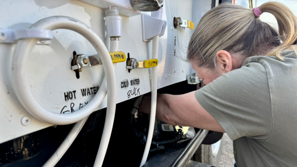 Near the end of it we realized had enough slack in the water line we could pull it partly out of the compartment. Once we did that the fix was easy. (susan here: sometimes the obvious escapes us.)