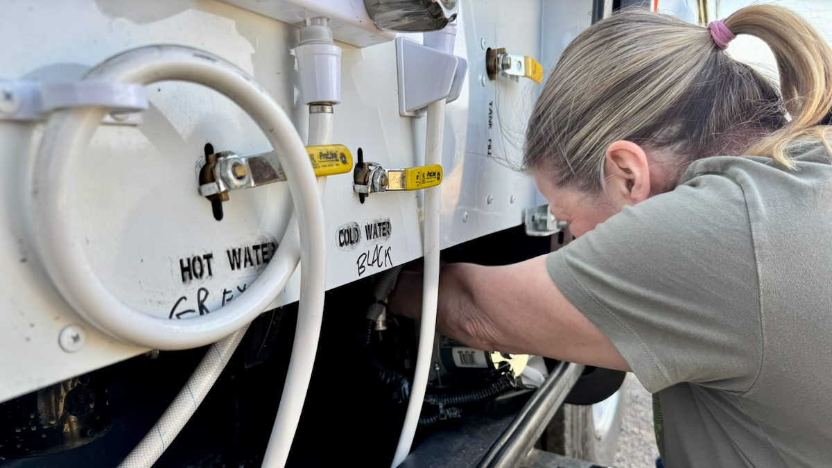 The water pump has been giving us fits for a while. Paul tried to fix the minor leak with teflon tape but the compartment is so tight his huge hands just don’t work in there. So this morning it overheated and shut off from constant running and it was Susan’s turn to do the 15 minute fix.