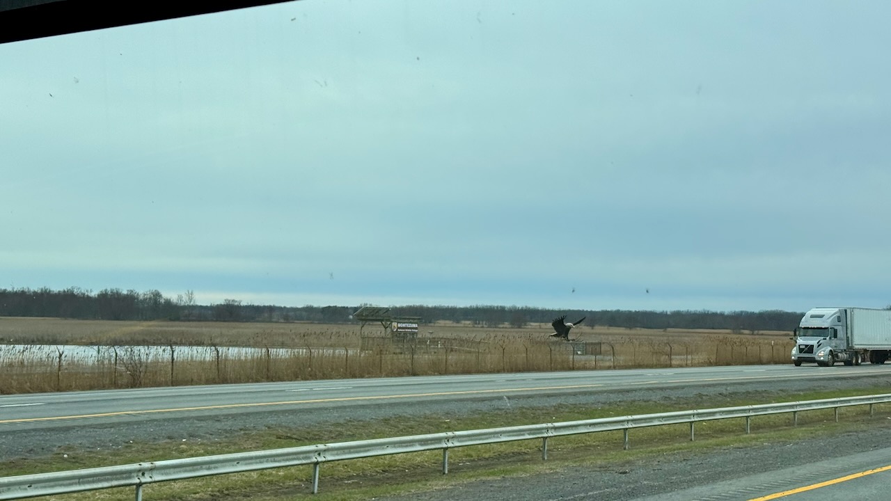 We were seeing more and more, oh wait, we stopped to change drivers again, LOL. Paul noticed the Montezuma Wildlife Refuge marked on the GPS. We were here last year! So Susan got a shot of the Montezuma Eagle. We really like this wildlife refuge. Very good bird watching opportunities here.