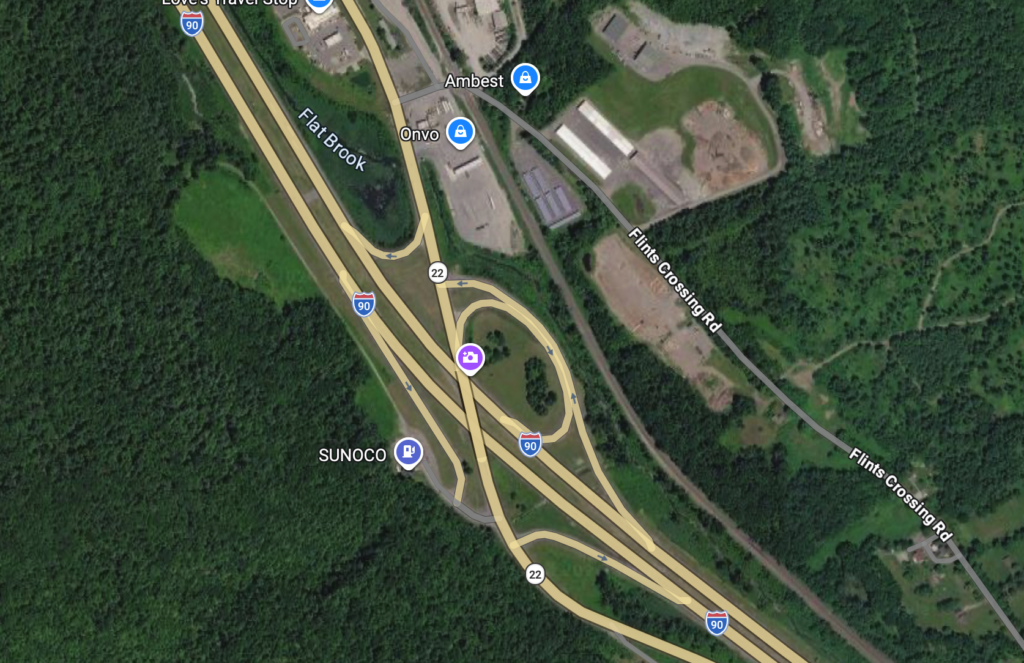 A half hour later we were in the Lee rest area, to top off for gas. Why not at Blandford? There isn’t big rig parking on the gas side and the big rig side only has diesel. We topped off to avoid the higher gas prices in NY. Wow! Somebody had a bad day at the pumps.
